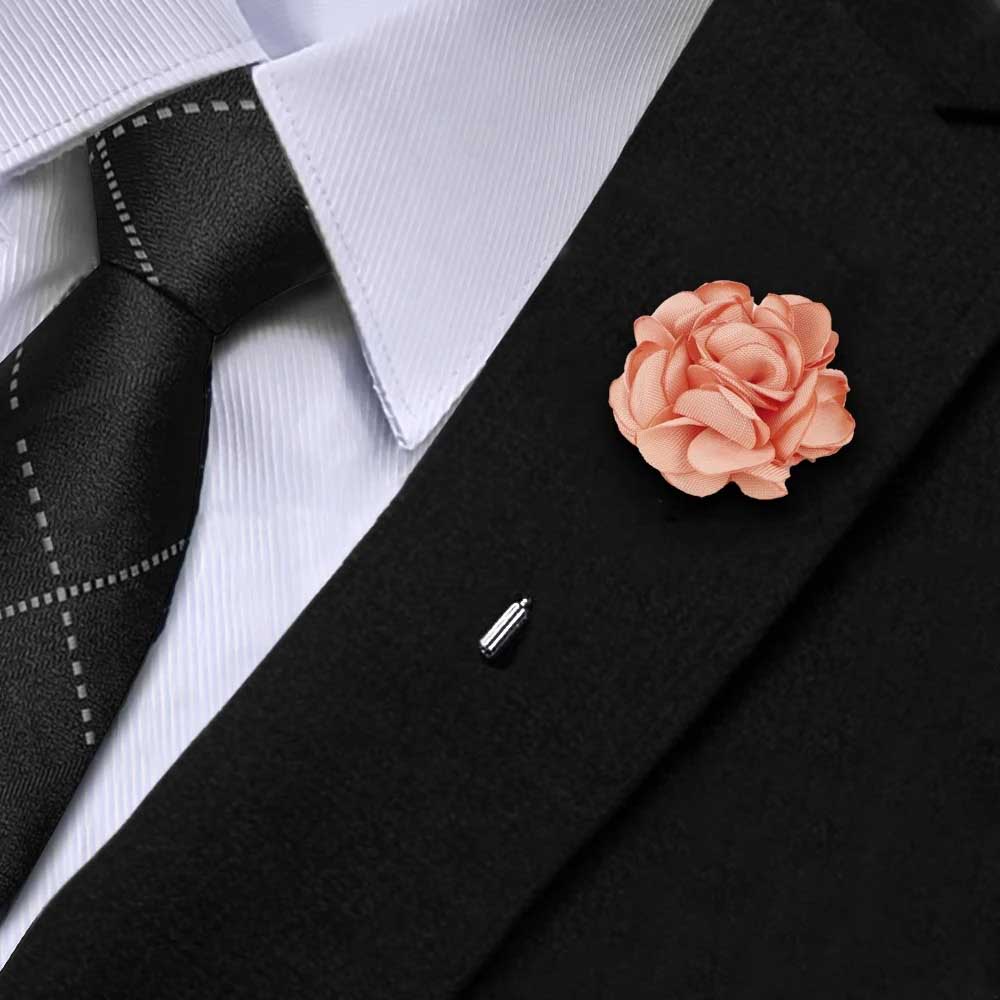 Kavajnål med tygblomma. Blomman är monterad på en rak nål med avtagbar säkerhetsände i metall. Passar till kavajslag och används som dekorativ accessoar vid formella eller festliga tillfällen.